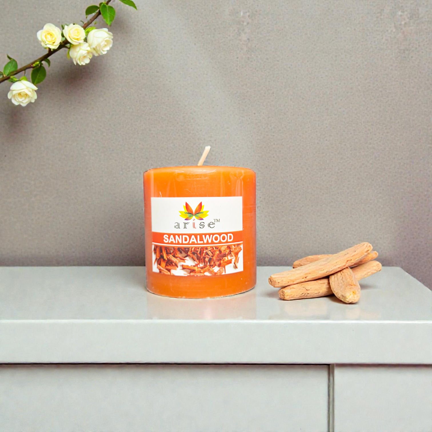 Arise Sandalwood Candle is a premium scented pillar candle designed to fill your space with the divine and woody fragrance of pure Sandalwood (Chandan). The candle features a vibrant orange color and is infused with aromatic oils that promote deep relaxation. It is ideal for meditation, spiritual rituals, or simply unwinding after a long day.