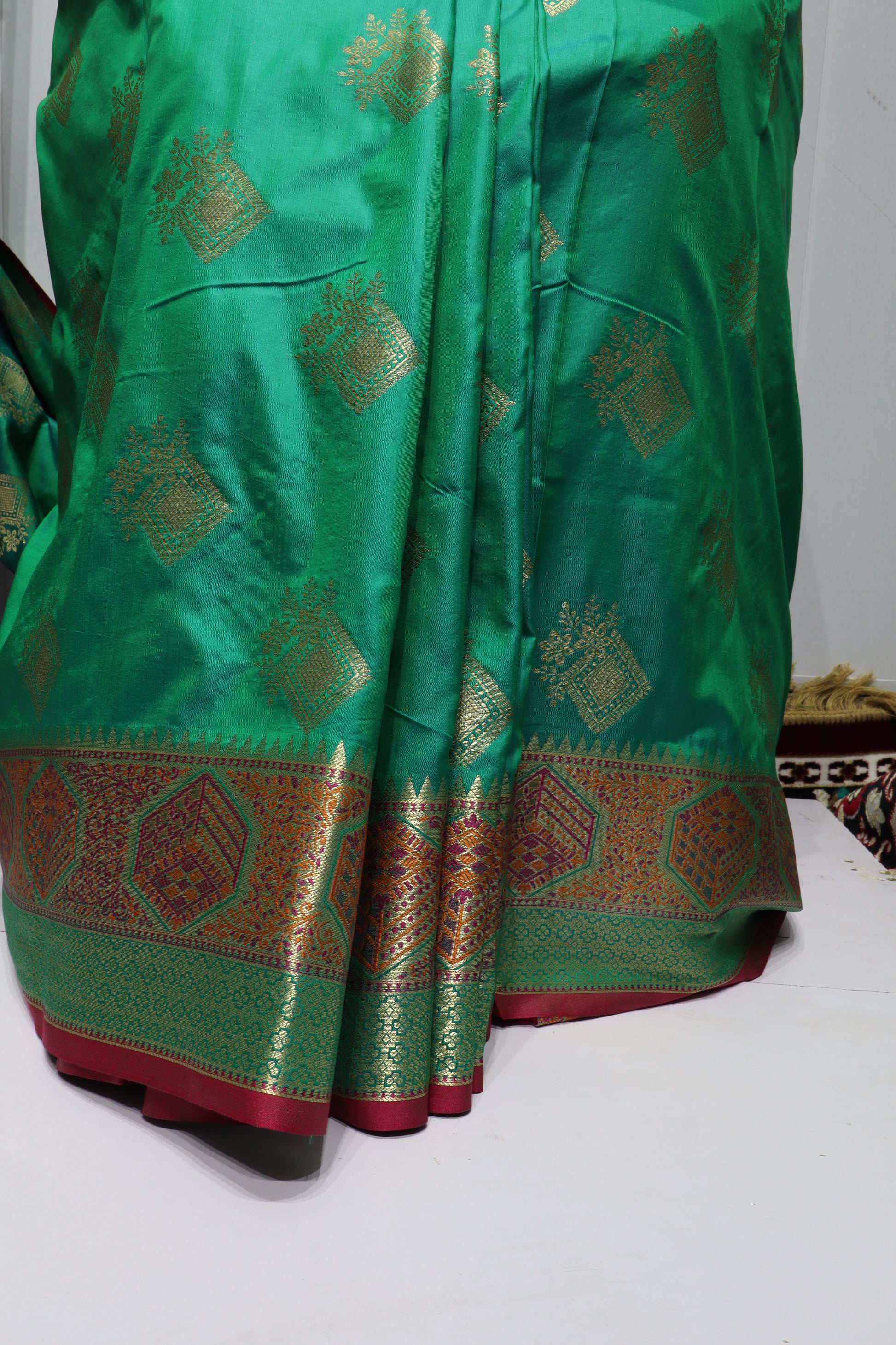 Emerald Green Silk Saree with Rich Gold Zari Work & Maroon Contrast Border(41)