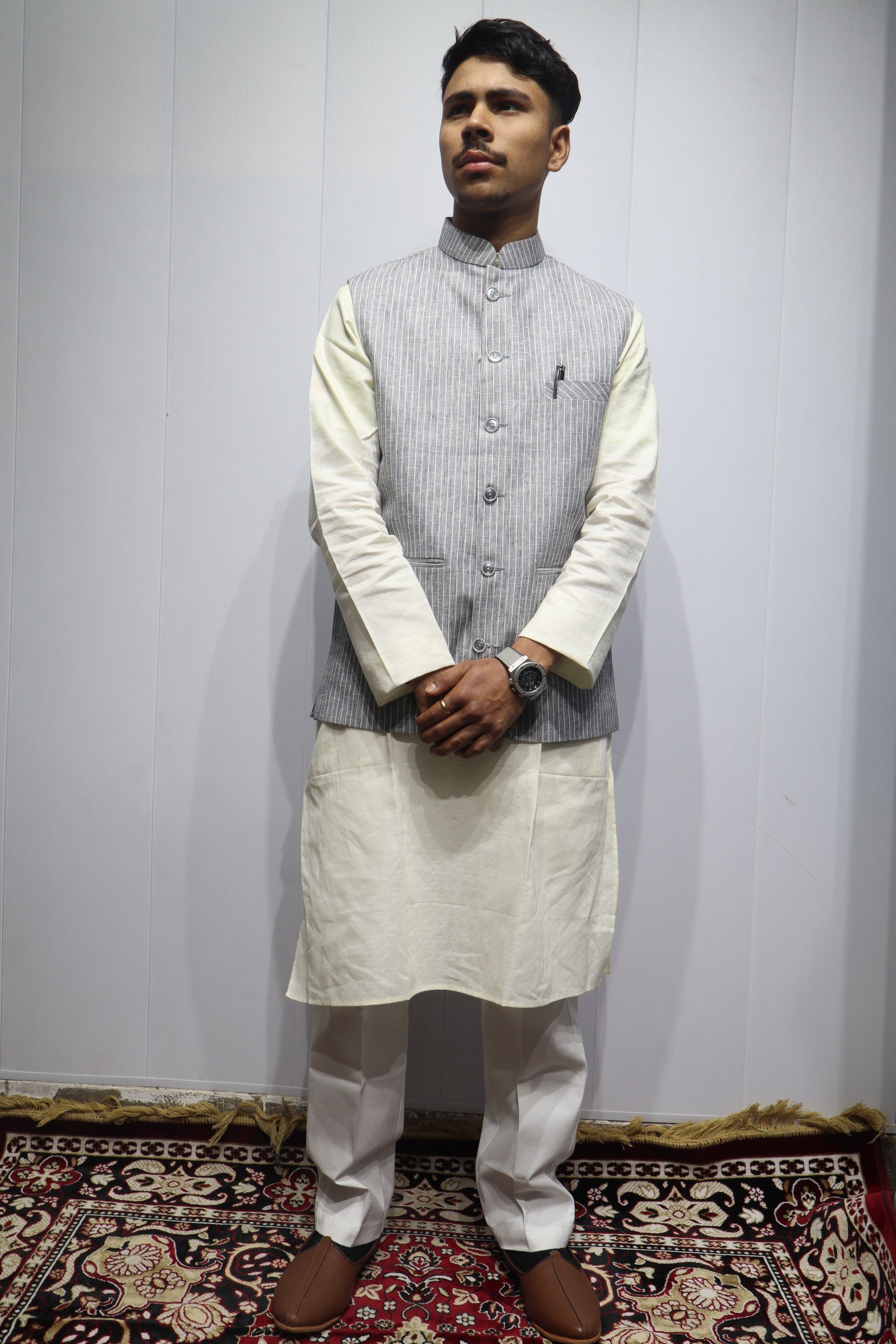 Upgrade your ethnic wardrobe with this men’s grey striped cotton Nehru jacket, designed for understated elegance and everyday sophistication. Crafted from premium-quality cotton fabric, this jacket features fine vertical stripes that add a smart, elongated look. The classic mandarin collar, neatly aligned buttons, and tailored structure make it a versatile layering piece for both traditional and semi-formal outfits. Comfortable and breathable, it pairs effortlessly with white or cream kurta-pajama sets, making it ideal for office functions, festive gatherings, cultural events, and daytime celebrations. A perfect blend of comfort, style, and timeless appeal.