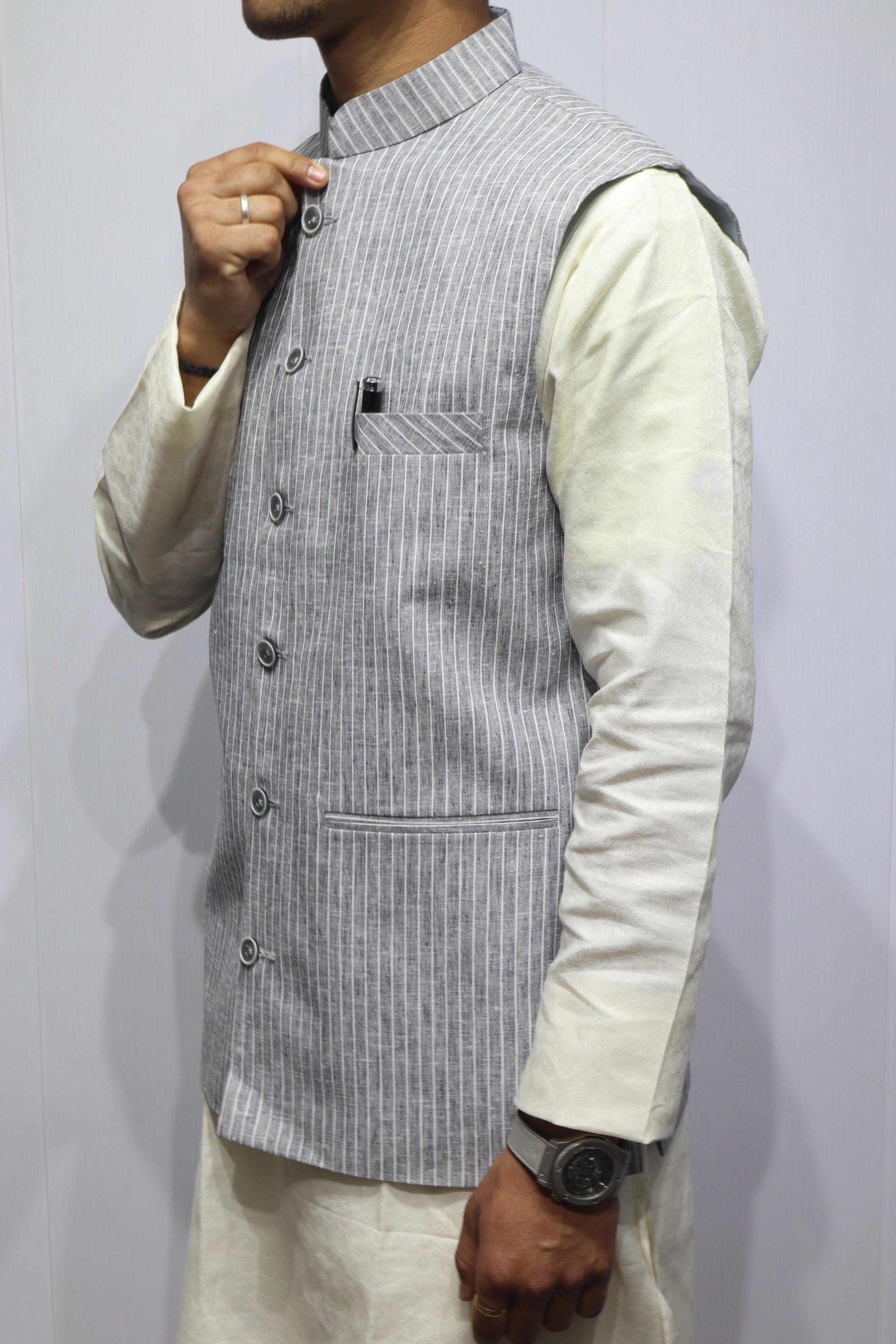 Men’s Grey Striped Cotton Nehru Jacket – Classic Ethnic & Formal Wear