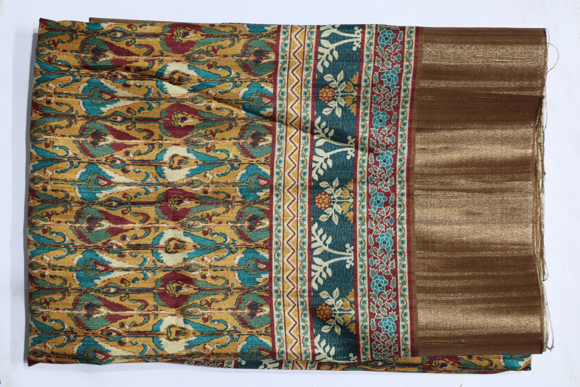 Mustard Yellow & Teal Printed Silk Saree with Rich Zari Pallu and Traditional Border