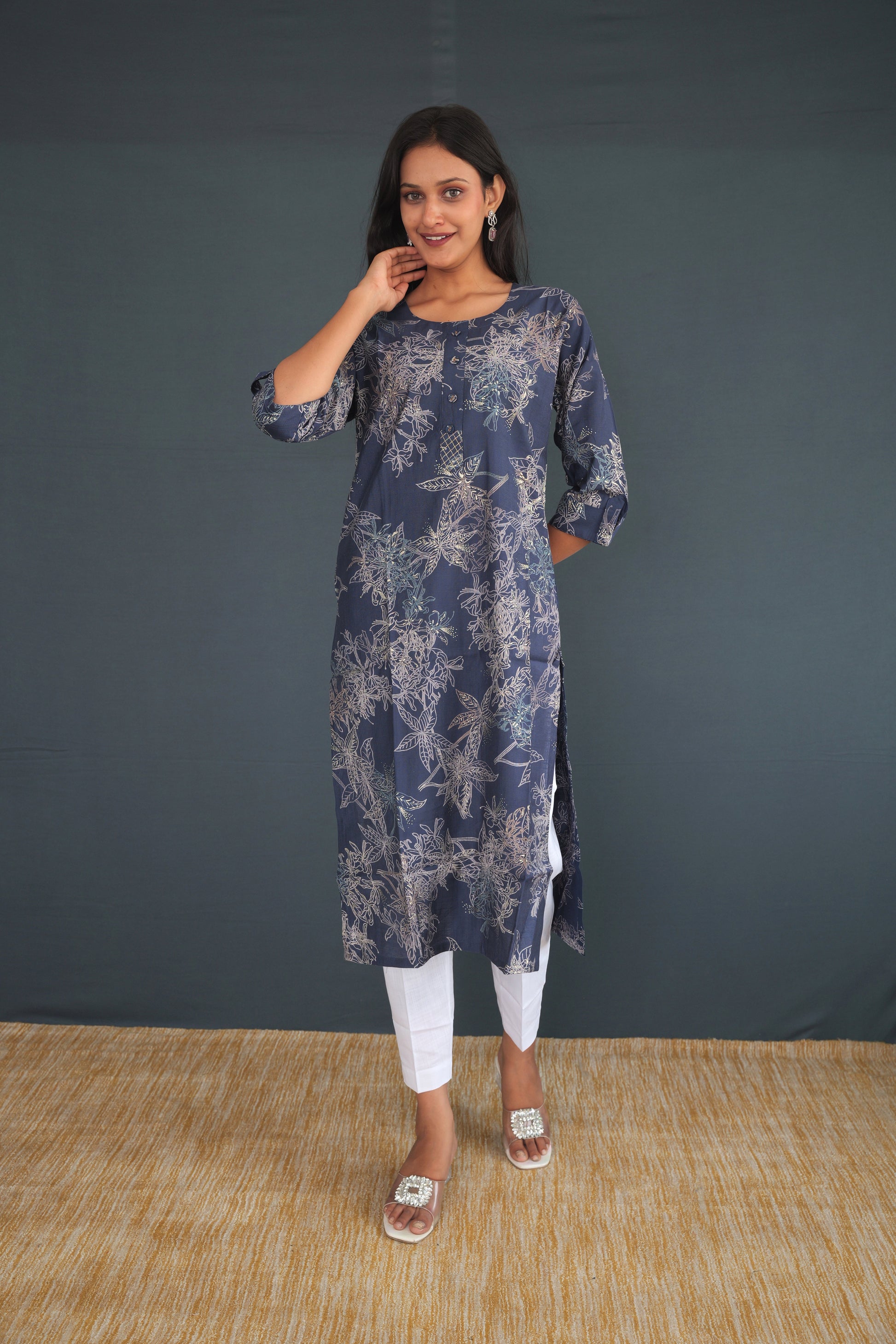 The sophisticated floral prints that add an artistic touch to the deep navy blue hue make it a versatile piece that can be worn to casual events, festive occasions, or the office. This kurti, which has a round neckline, three-quarter sleeves, and a straight silhouette, combines elegant detailing with simplicity.