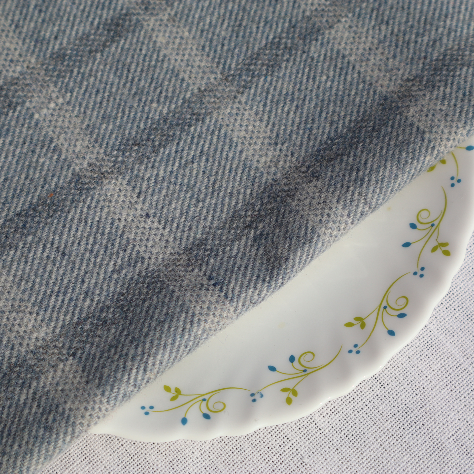 This elegant woolen tweed fabric features a refined blue-grey check pattern that blends classic charm with modern sophistication. The surface showcases a soft yet textured feel, highlighting the richness of traditional tweed weaving. The balanced color tones create depth and visual interest, making the fabric suitable for both formal and casual winter wear. Its natural wool composition provides comforting warmth while maintaining a breathable structure, ensuring all-day comfort in colder seasons.