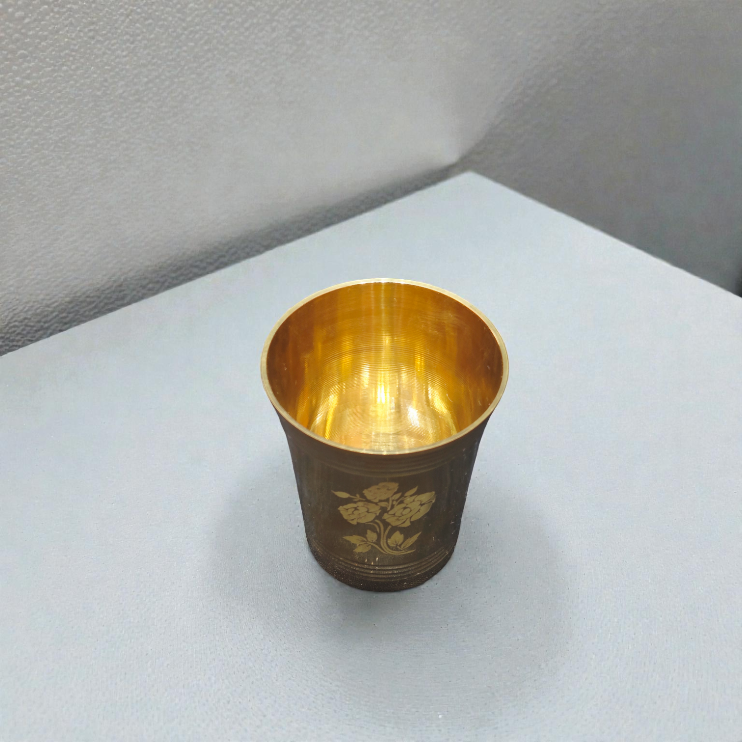 Pure Brass Glass with Floral Etching – Traditional Pital Tumbler for Drinking Water & Ayurvedic Health Benefits Handcrafted from pure brass, this traditional pital tumbler combines timeless artistry with functional design. The intricate floral etching adorns the surface, creating visual depth while the textured finish ensures a secure, non-slip grip—ideal for daily use with water, milk, or traditional Lassi. Brass vessels have been valued in Ayurvedic wellness practices for centuries, believed to support natural health benefits when used for drinking. The elegant detailing makes it a refined addition to any home, appealing to those who value both heritage craftsmanship and mindful living.