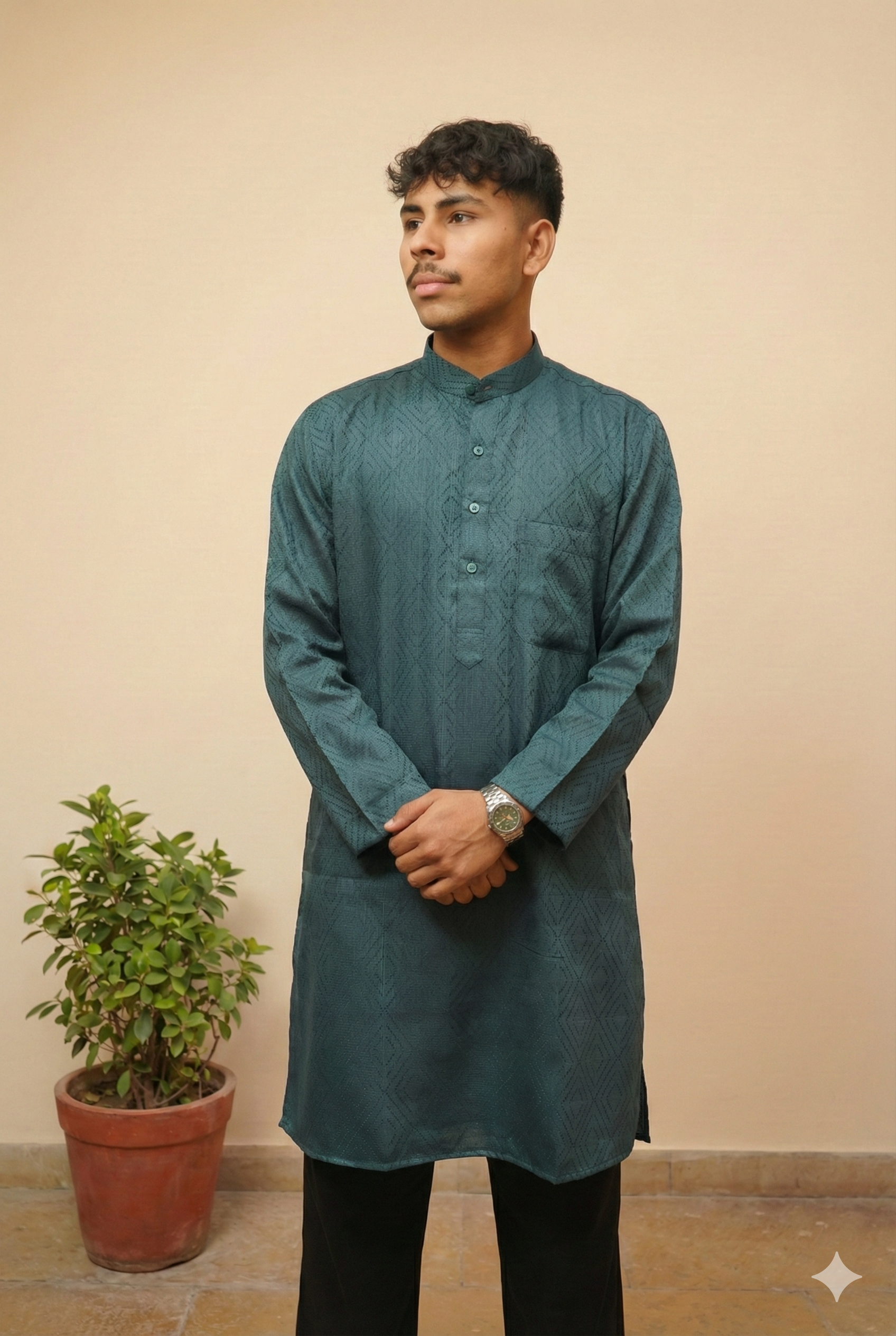 This teal green cotton kurta features an elegant self-design pattern that adds depth and sophistication to classic ethnic wear. Crafted from high-quality breathable cotton fabric, it offers superior comfort while maintaining a structured and polished look. The subtle geometric texture enhances its visual appeal without being overpowering, making it perfect for festive occasions, family functions, office ethnic days, and special gatherings. Designed with a mandarin collar, full sleeves, and a clean button placket, this kurta strikes the perfect balance between tradition and modern style. Pair it with pajama, churidar, or dark trousers for a refined ethnic or Indo-western ensemble.
