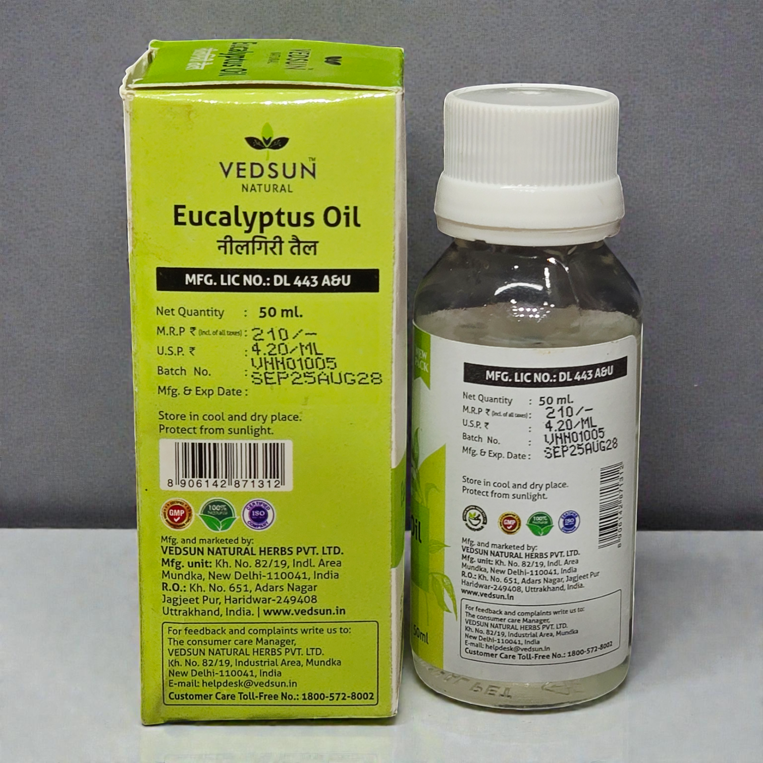 Vedsun Eucalyptus Oil (Nilgiri Tail) is a strong, 100% Pure medicinal oil derived from fresh Eucalyptus leaves. Officially approved by the Directorate of Ayush, it is famous for its cooling and refreshing aroma that instantly clears blocked noses and chest congestion. It also acts as a natural pain reliever for stiff muscles.