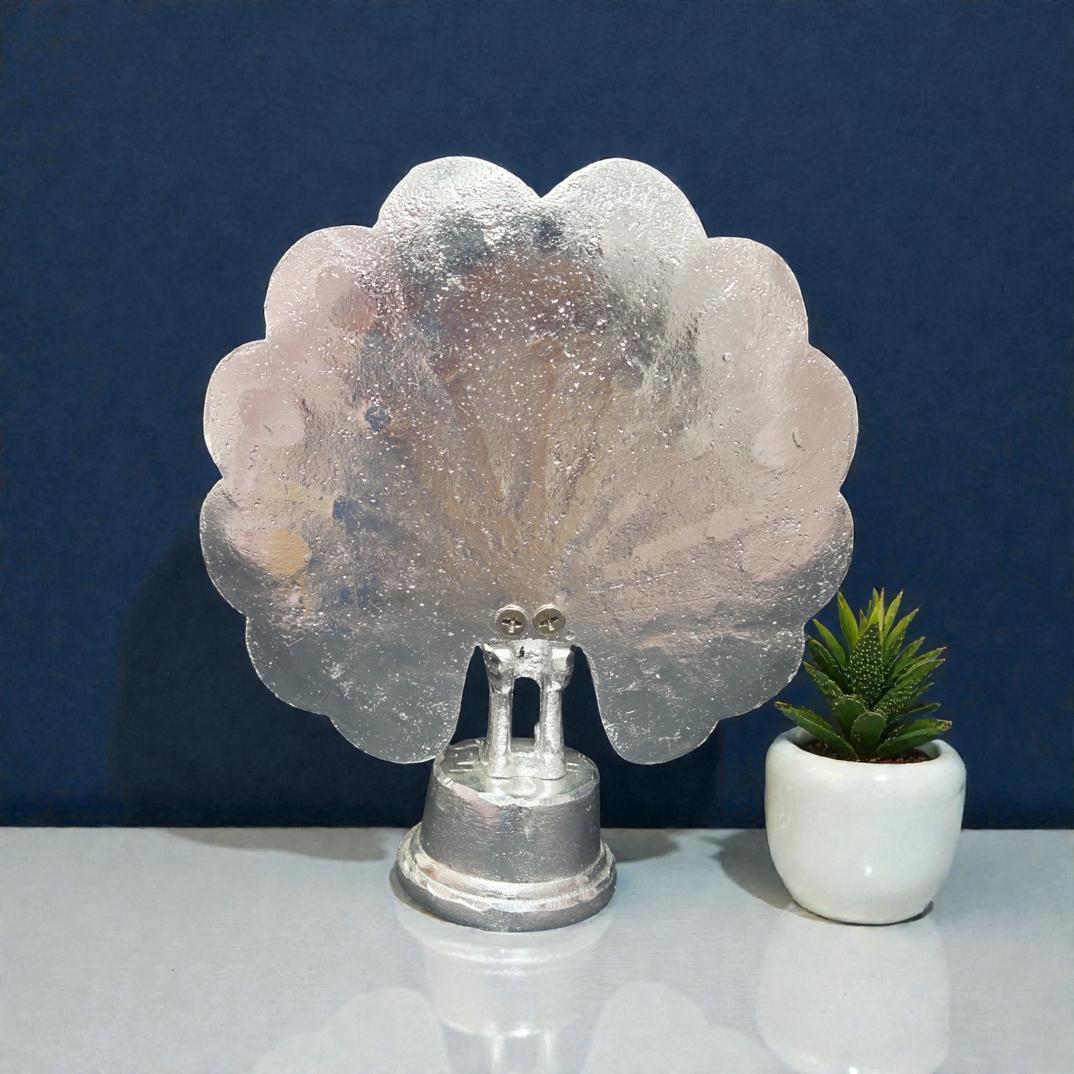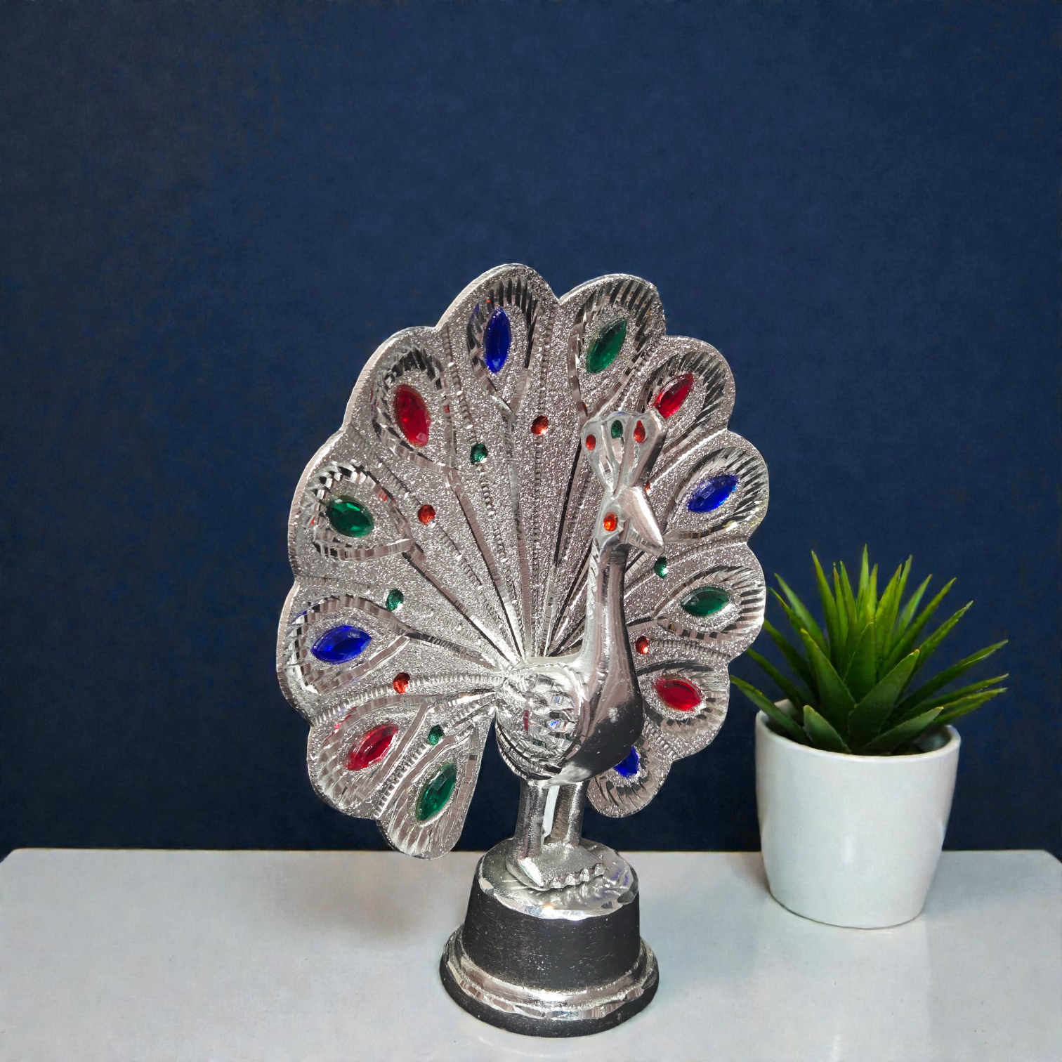 Handcrafted White Metal Dancing Peacock Idol – Decorative Mor Statue with Colorful Stone Work